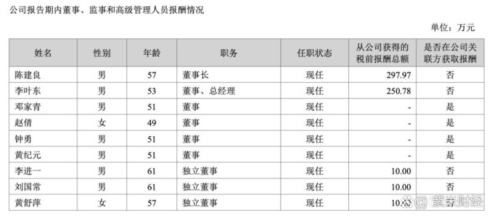 2024年年报显示,公司董事、监事和高级管理人员2024年报酬总额1,574.67万元。董事长陈建良2024年从公司获得的税前报酬总额为297.97万元。董事、总经理李叶东2024年从公司获得的税前报酬总额为250.78万元,副总经理、董事会秘书谢华2024年从公司获得的税前报酬总额为121.07万元牛策略,以上人员均未在公司关联方获取报酬。
